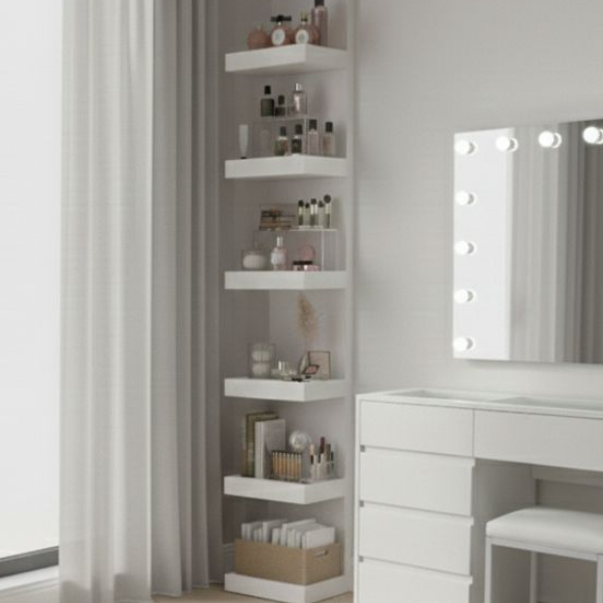 יחידת מדפים מעוצבת בגימור ריהוט, שנוצרה כהשלמה מושלמת לפינת האיפור.