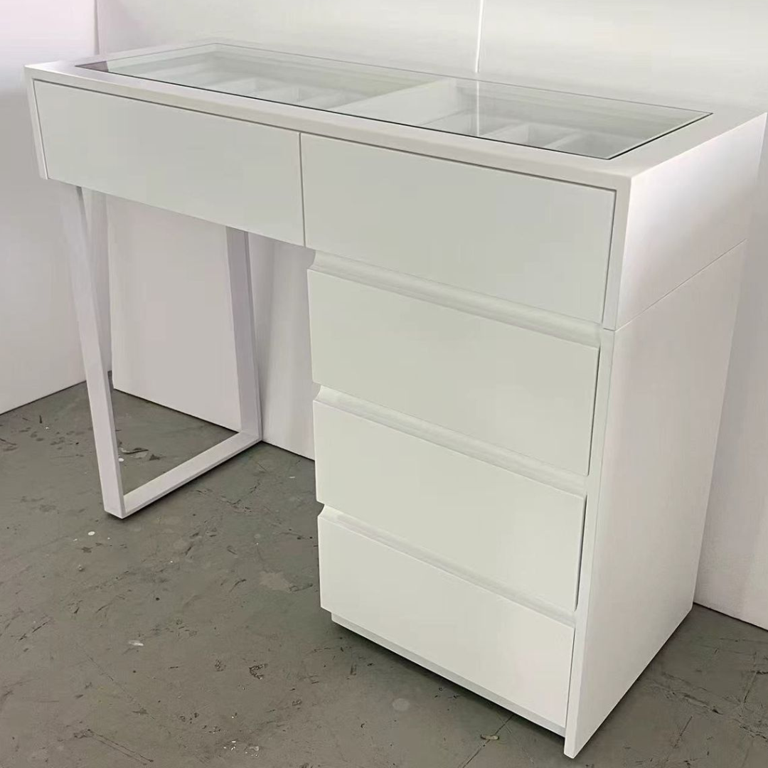 השידה משלבת קו נקי ואלגנטי עם מגירות צדדיות נוחות לגישה, ומשטח עליון מזכוכית שקופה למראה יוקרתי וקליל.